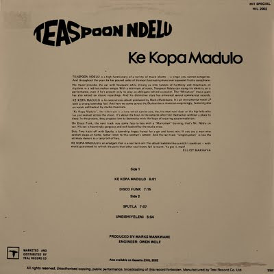 Today we're delving into a tasty mix of soul, funk and mbaqanga with the late saxophone legend Teaspoon Ndelu and his second solo album, Ke Kopa Madulo, produced by Marks Mankwane and released on the Hit Special label in 1981.